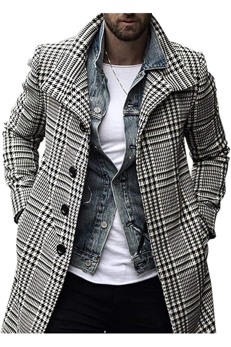 Springrain Men S Wool Blend Notched Lapel Single Breasted Mid Long Trench Pea Coat Blackandwhite Xs At Amazon Men S Clothing Store